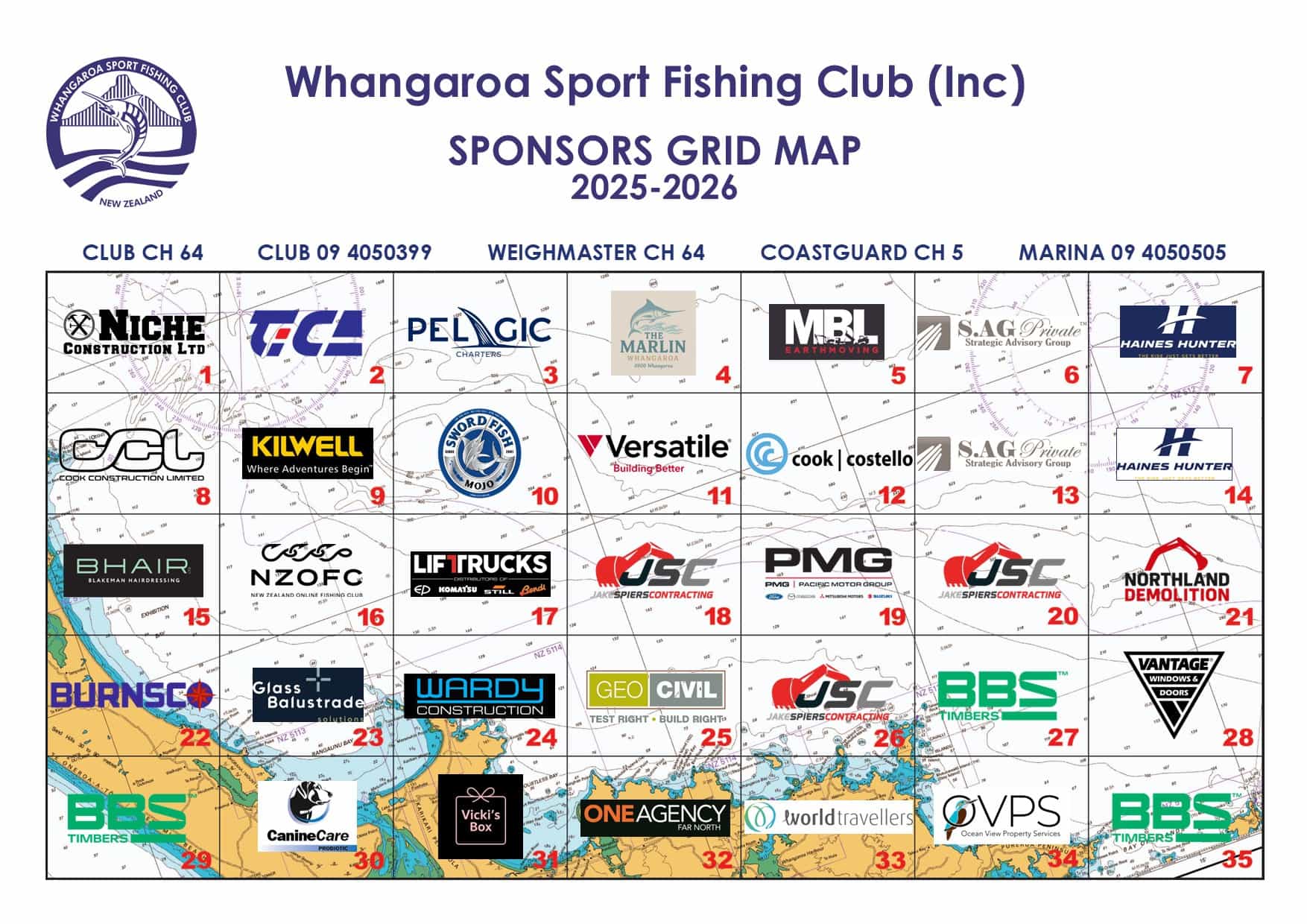 1.Niche Construction Ltd, 2.Tica, 3.Pelagic Charters, 4.Marlin Hotel, 5.MBL Earthmoving, 6.S.AG Private, 7.Haines Hunter, 8.Cook Construction Ltd, 9.Kilwell, 10.Swordfish Mojo. 11.Versatile, 12.Cook Costello, 13.S.AG Private, 14.Haines Hunter, 15.B Hair Ltd, 16.NZOFC (New Zealand Online Fishing Club), 17.Liftrucks, 18.Jake Spiers Contracting, 19.PMG (Pacific Motor Group), 20.Jake Spiers Contracting, 21.Northland Demolition, 22.Burnsco (Opua), 23.Glass Balustrade Solutions, 24.Wardy Construction, 25.Geocivil, 26.Jake Spiers Contracting, 27.BBS Timbers, 28.Vantage Windows & Doors, 29.BBS Timbers, 30.Canine Care Probiotic, 31.Vicki's Box, 32.One Agency (Far North), 33.World Travellers, 34.OVPS (Ocean View Property Services, 35.BBS Timbers.